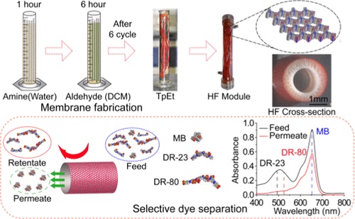 印度CSIR国家化学实验室Ulhas K. Kharul & Shebeeb Kunjattu H报道的本篇文章(ACS Appl. Mater. Interfaces 2024)中介绍了一种在室温下采用互变聚合方法制备可扩展的共价有机框架(COF)中空纤维(HF)膜的新方法。通过使用醛(1,3,5-三甲基邻苯三酮,Tp)和胺(4,4’-偶氮苯胺(Azo)和4,4’,4"-(1,3,5-三嗪-2,4,6-三基)三苯胺(Tta))作为前体,在聚丙烯腈HF基底上构建了2D COF膜。该COF膜在PAN基底上表现出对Direct red-80的99%拒绝率,并具有显著的溶剂透过性。进一步优化前体浓度以提高膜的透过性能。耐久性研究显示膜对有机溶剂具有优异的稳定性。此研究还展示了膜制备方法的易扩展性。该方法还被推广用于制备基于阳离子COF的膜,这些带电膜表现出增强的拒绝性能。最后,该方法可以促进使用基于COF的膜进行具有挑战性的分子筛选应用。