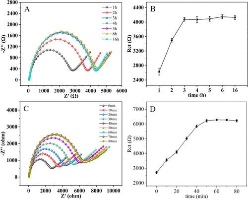 (1) 循环伏安法和电化学阻抗谱(EIS)表征了生物传感器的构建过程,结果表明MOF、Con A、BSA和INV的连续修饰导致电流响应明显降低和阻抗半圆直径增大。