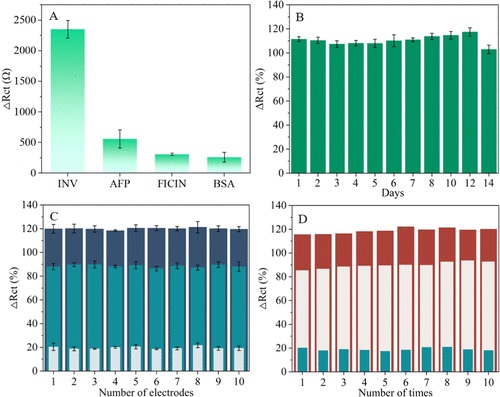 (4) 用10个单独的电极检测10-12、10-14和10-16 M的INV,相对标准偏差分别为0.61%、1.20%和4.89%,表明生物传感器具有出色的重现性。重复测定10-12、10-14和10-16 M的INV 10次,相对标准偏差分别为1.80%、2.61%和6.29%,显示了良好的重复性。