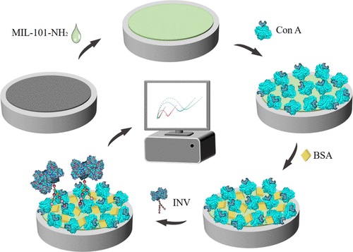 (2) 利用MIL-101(Cr)-NH2作为支撑基质,其氨基固定Con A作为分子识别元件捕获INV模型糖蛋白。