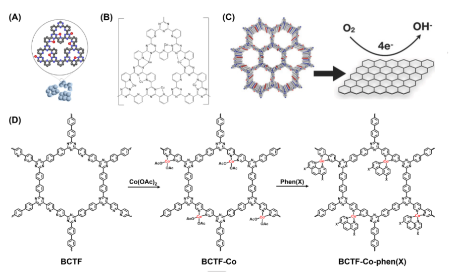 (1) 金属引入:通过在COFs中引入金属离子,如Pt和Cu,可以显著提高ORR催化性能。例如,Kamiya等人报道了将金属引入共价三嗪框架(CTF)中,以增强ORR催化性能的方法。