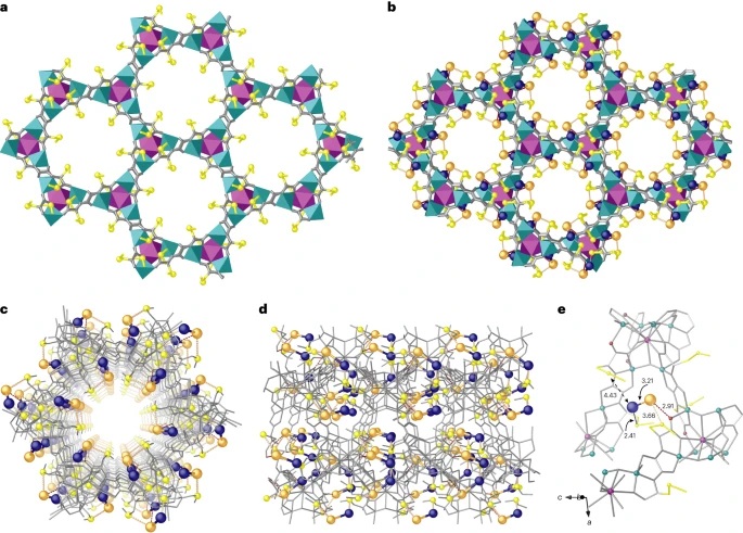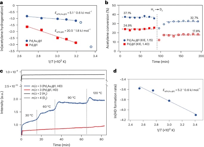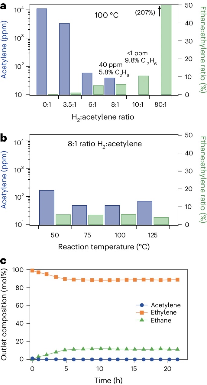 卡拉布里亚大学Donatella Armentano&巴伦西亚大学Emilio Pardo&瓦仑西亚理工大学Antonio Leyva-Pérez等报道的本篇文章(Nat. Catal. 2024)中报道了一种负载在硫醚功能化金属有机骨架(MOF)上的分子Pdδ±Au0二聚体催化剂,在模拟工业(前端)条件下,对富乙烯气流中的乙炔进行半氢化反应,乙炔转化率≥99.99%(剩余乙炔≤1 ppm),选择性高达94%,唯一的副产物是乙烷。该材料的性能相比现有催化剂非常突出,它在35-150°C的温度范围内以近乎无能垒的表观活化能(~1 kcal/mol)工作。结合实验和理论计算的机理研究表明,Pd原子作为主要催化位点,而Au原子和MOF的硫醚基团在H2解离步骤中起辅助作用。本研究为这一工业反应的机理提供了见解,并在原子水平上将单一孤立催化位点和合金化的概念结合在一种异核催化剂上。