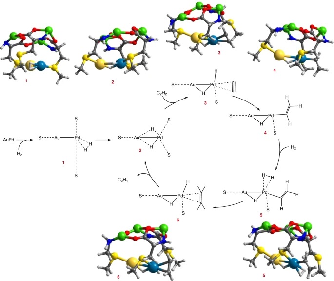 (3) 本文作者提出利用MOF作为纳米反应器,合成和稳定具有精确结构的Pd1-Au1二聚体催化剂。密度泛函理论计算表明Pd1-Au1二聚体应该是乙炔选择性加氢的最佳催化剂。