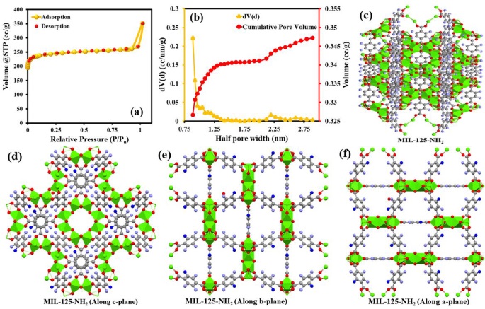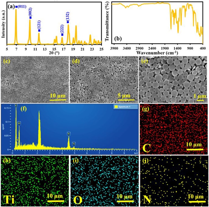 (1)XRD分析证实了MIL-125-NH2 MOF的结晶度,主要衍射峰对应(011)、(002)和(121)晶面。