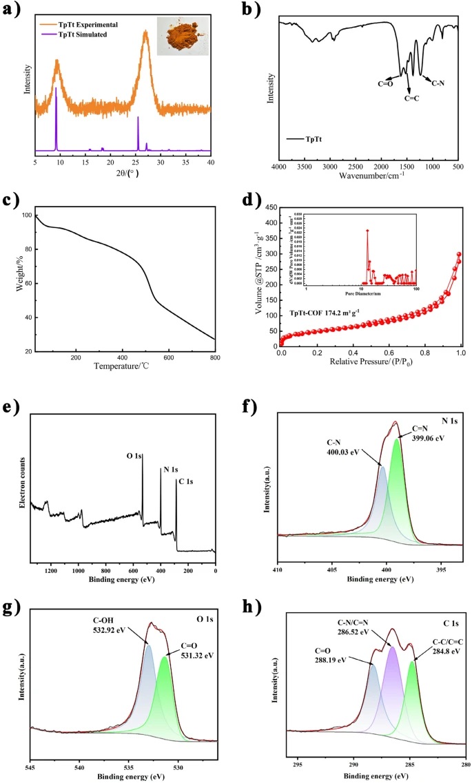 (3) BET比表面积分析表明,TpTt的BET比表面积为174.2 m2/g,BJH分析显示其孔径超过10 nm,表明TpTt-COF具有介孔结构。