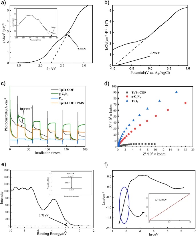 (5) Mott-Schottky分析表明TpTt-COF是n型半导体,其平带电位约为-1.16 V。结合2.62 eV的带隙能,TpTt-COF的价带电位为1.46 V。