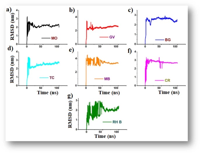 University of Birjand的Farzaneh Farzad团队报道的本篇(npj Clean Water 2024, 7, 27 )中探究了三维共价有机框架(COFs)对染料污染物的吸附行为。通过分子动力学(MD)和良温元动力学模拟,评估COFs对七种染料污染物(DPs)的吸附能力,包括甲基橙(MO)、幽兰紫(GV)、亮绿(BG)、托罗纳米氯化物(TC)、亚甲基蓝(MB)、阿那红(CR)和罗丹明B(Rh B)。通过模拟轨迹计算了几个描述符,包括相互作用能、均方根偏差、径向分布函数、溶剂可及表面积、平均平方位移和氢键数量,以了解吸附过程。结果显示,MO/COFs系统表现出卓越的稳定性,总相互作用能达到-448.54 KJmol-1。各染料分子在MO和Rh B-COFs系统中的密度分布显示出最高峰值分别约为325.79和26.75 kg/m³。DPs/COFs复合物在全局极小点处的自由能值分别达到约-512.127、-435.603、-381.244、-300.313和-283.230 kJmol-1。TFFPy-COF的设计独特性、超快速动力学、高吸附容量和良好的再利用性使其在水环境中去除染料具有巨大潜力。