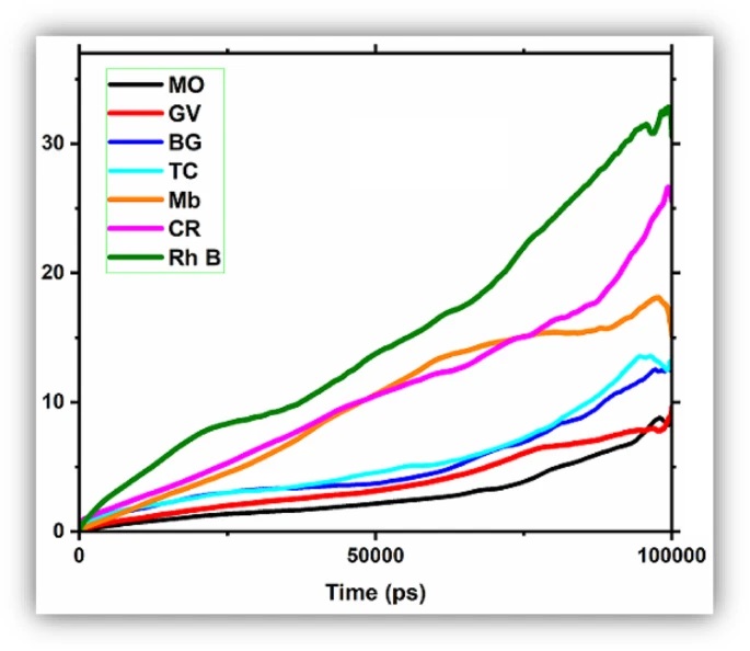 5)均方位移(MSD):计算了有机染料污染物的扩散系数,MO/COFs系统的斜率最低,表明其吸附的染料分子在表面上的移动受到限制。