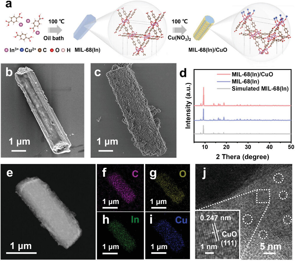 (1) 首先通过In离子与对苯二甲酸配位合成得到纳米棒状MIL-68(In),再将其加热浸渍于硝酸铜溶液中,在MIL-68(In)表面原位生长出约0.2 μm厚的纳米CuO层,形成MIL-68(In)/CuO异质结构。