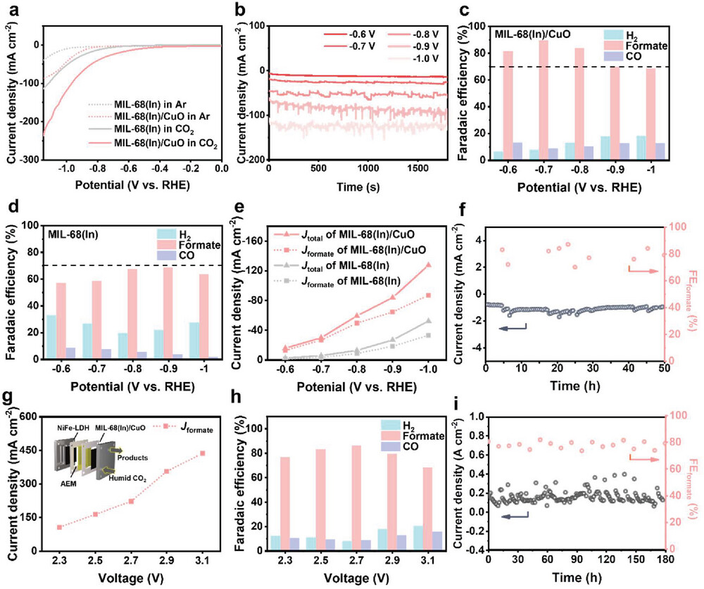 (3) 电化学测试结果显示,MIL-68(In)/CuO在流动电解池中于-0.7 V vs. RHE电位下,CO2还原制备甲酸盐的法拉第效率达89.7%,电流密度为27.2 mA cm-2,分别比MIL-68(In)提高20%和6.4倍。在膜电极组件电解池中,MIL-68(In)/CuO在3.1 V时甲酸盐的部分电流密度达到436.7 mA cm-2,在2.7 V下能稳定运行180小时。
