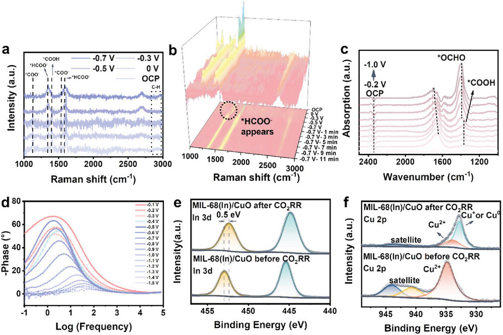 (4) 原位电化学阻抗谱和XPS结果揭示,在CO2还原过程中,MIL-68(In)/CuO催化剂发生相变,In和Cu形成双金属界面,产生In-Cu双活性位点,降低了形成HCOO-中间体所需能量。