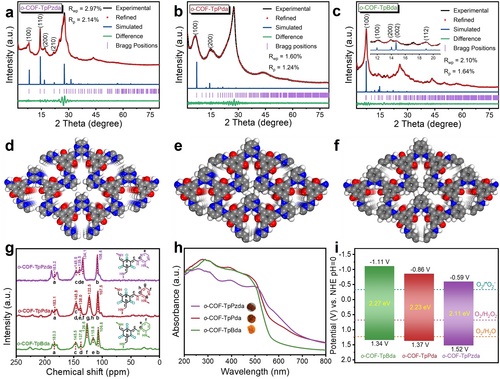 1) 结构表征:通过PXRD、NMR、FT-IR和XPS对COFs的结构进行了详细表征。PXRD结果显示o-COF样品具有六角结构,与模拟的AA堆叠模型一致。NMR和FT-IR谱图证实了COFs中C=O和C=C键的存在,以及β-酮烯胺基团的形成。XPS分析进一步证实了COFs中C、N和O元素的存在,并揭示了N原子在不同COFs中的分布情况。