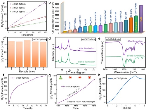 2) 最佳的o-COF-TpPzda在1小时内的H2O2产生速率达到4396 μmol·g^-1·h^-1,并具有48小时的长期连续H2O2光合成性能,优于初始H2O2产生速率为6434 μmol^-1·g^-1·h^-1但在短时间内活性迅速下降的p-COF-TpPzda。