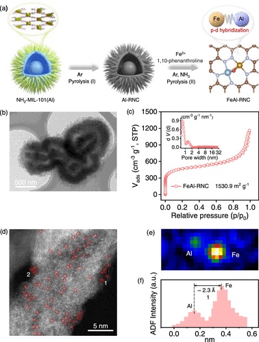 2) 通过两步热解过程从Al-MOF制备了FeAl-RNC催化剂。首先得到Al-RNC,然后与铁络合物溶液混合,进行第二步热解。