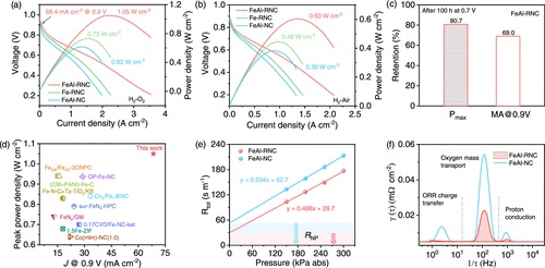 3)基于FeAl-RNC的质子交换膜燃料电池(PEMFC)展现出优异的活性(0.9 V时为68.4 mA cm–2)、高功率峰值(1.05 W cm–2)以及良好的稳定性,在H2-O2条件下0.7 V下运行100小时后电流仅损失7%。