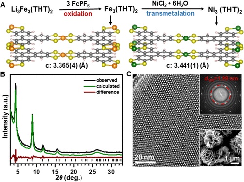 - PXRD分析:使用Rigaku MiniFlex X射线衍射仪对Ni3(THT)2进行了表征,发现其与Fe3(THT)2的衍射峰几乎一致,表明了晶体结构和形态在金属取代后得以保持。