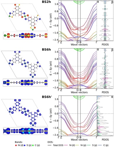 7. 计算模拟:通过周期性密度泛函理论(PBC-DFT)计算,研究了Ni3(THT)2的电子结构和能带结构,发现没有明显的带隙,且导带主要涉及配体S原子。