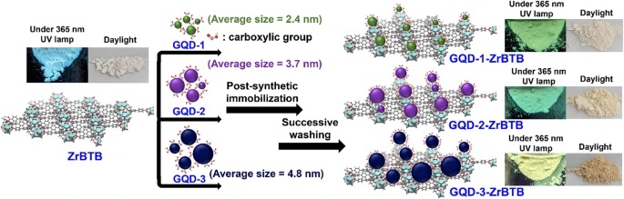 本研究展示了一种在2D锆基金属-有机框架上后合成固定GQDs的方法,制备了具有光致发光性能的MOF-GQD复合材料。该方法具有普适性,可用于固定不同尺寸和功能的GQDs。固定在MOF上的GQDs在干粉状态下仍保持发光特性,且在水中稳定。此外,GQD-1-ZrBTB复合材料在检测Cu2+离子时表现出良好的选择性和灵敏度。