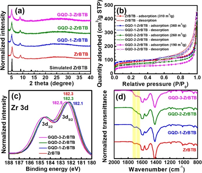 2) XPS分析:GQD-1和GQD-3在ZrBTB中的固定导致Zr 3d峰的负移和正移,表明GQDs与ZrBTB的六连接节点成功配位。