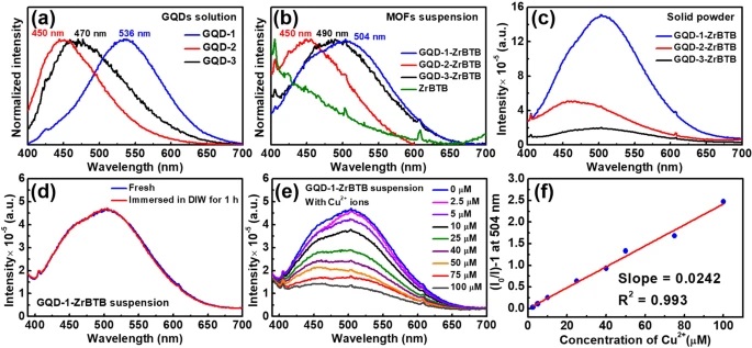 6) 铜离子检测:使用GQD-1-ZrBTB作为检测铜离子的传感材料,通过PL光谱变化评估了其对铜离子的检测能力。
