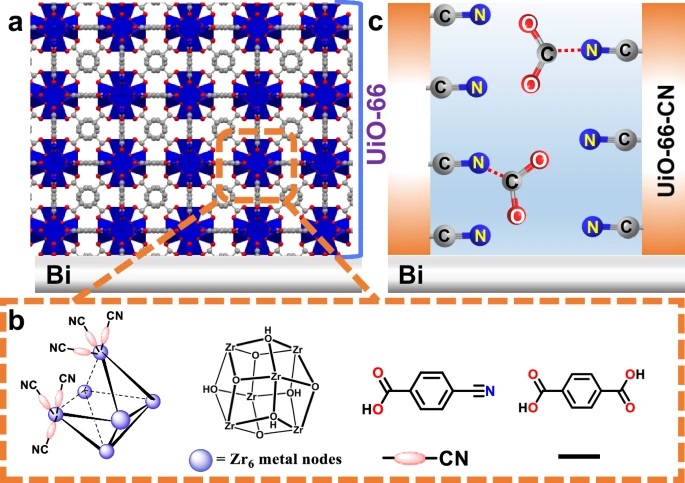 通过在Bi电催化剂上引入UiO-66-CN MOF层,不仅实现了对CO2的高效吸附和活化,还显著提高了eCO2RR的选择性和活性。这一策略为设计高效的异质电催化剂提供了新的分子手段,推动了电化学CO2还原技术向实际应用的方向发展。