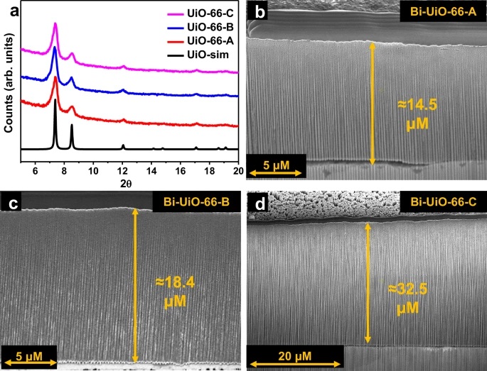 2. 通过粉末X射线衍射(PXRD)分析确认了UiO-66膜在Bi箔上成功合成。通过扫描电子显微镜(SEM)和聚焦离子束(FIB)分析确认了UiO-66膜的多孔性、均匀性和连续性。
