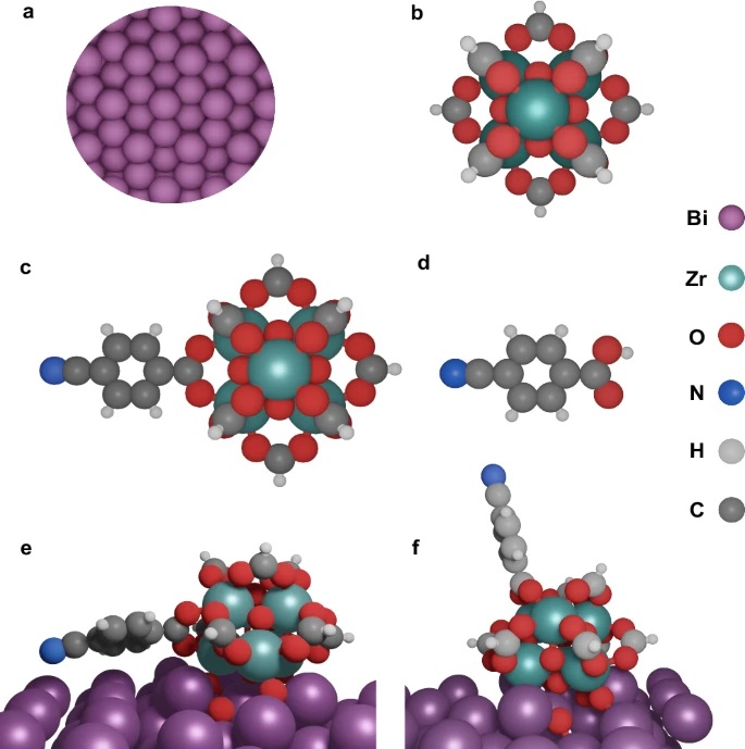 3. DFT模拟:构建了UiO-66-CN与Bi(0001)表面的界面模型,模拟了不同可能的BA-CN取向,提供了对实验观察与理论模型之间关系的深入理解。
