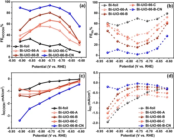 6. 在气密H型电池中进行了电化学CO2还原反应(eCO2RR)测试,使用Ag/AgCl作为参比电极,铂片作为对电极,Bi箔(带或不带UiO-66膜)作为工作电极。