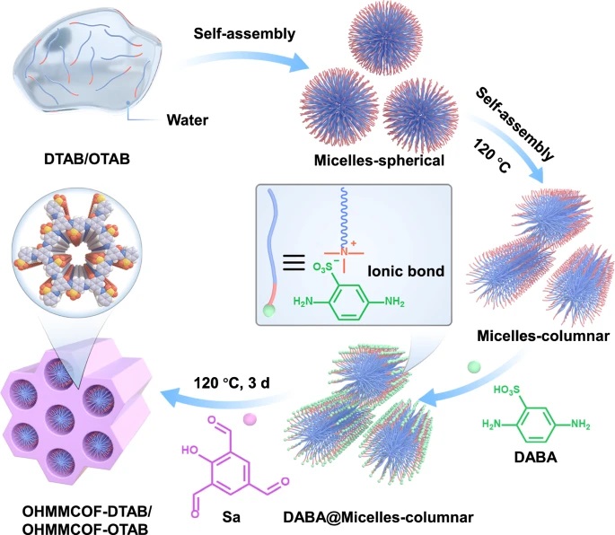 2)合成OHMMCOF-DTAB/OHMMCOF-OTAB:通过将十二烷基三甲基溴化铵(DTAB)或十八烷基三甲基溴化铵(OTAB)作为软模板,与Sa和DABA反应,合成了含有有序层次微孔/介孔结构的COFs。