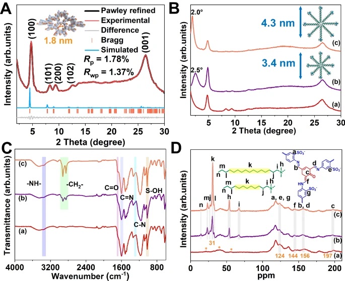2)FT-IR和13C SSNMR光谱:用于表征合成的COFs的化学结构,确认了C=N、C=O和S-OH等官能团的存在。