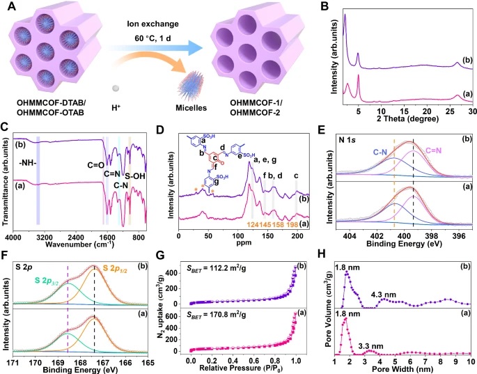 3)模板去除实验:通过离子交换法去除OHMMCOF-DTAB/OHMMCOF-OTAB中的DTAB/OTAB模板,得到了最终的OHMMCOF-1/OHMMCOF-2材料。