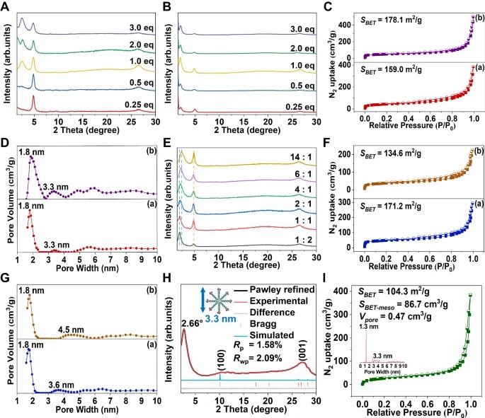 4)孔隙性调节实验:通过改变DTAB/OTAB的浓度,调节了OHMMCOFs的微孔/介孔比例,并通过混合不同比例的模板,实现了介孔尺寸的精确控制。