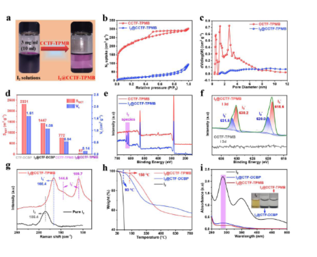 5. I2吸附能力测试:通过XPS、FT-IR和拉曼光谱分析了I2在CCTF-TPMB中的吸附状态。