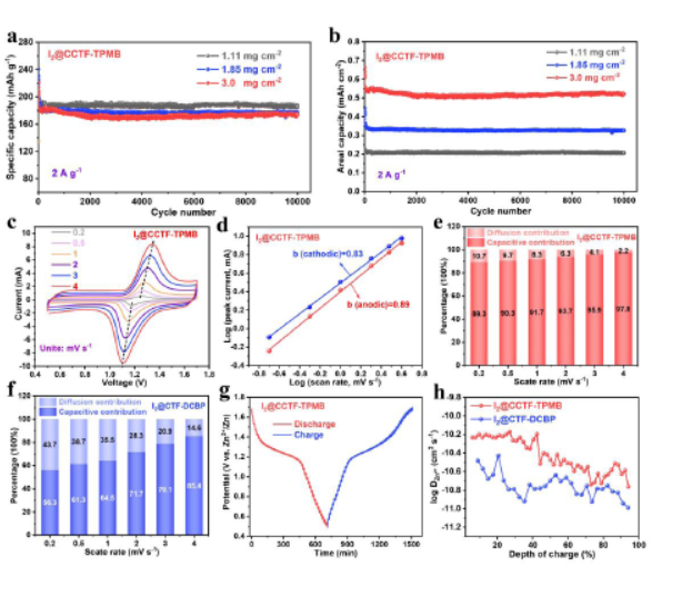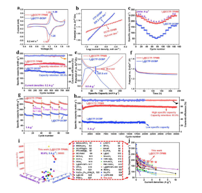6. 电化学性能表征:通过CV、Tafel图、GITT和长期循环性能测试评估了I2@CCTF-TPMB阴极的电化学活性和稳定性。