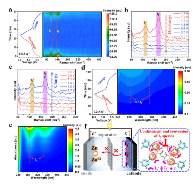 7. 原位拉曼和紫外-可见光谱分析:通过原位拉曼和紫外-可见光谱分析了I2@CCTF-TPMB在充放电过程中的反应机制。