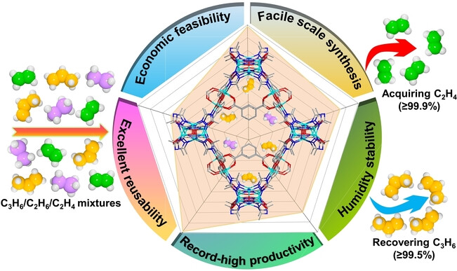 【MOF分离乙烯丙烯】:可规模化合成的稳定MOF用于乙烯纯化和丙烯回收,实现创纪录的效率