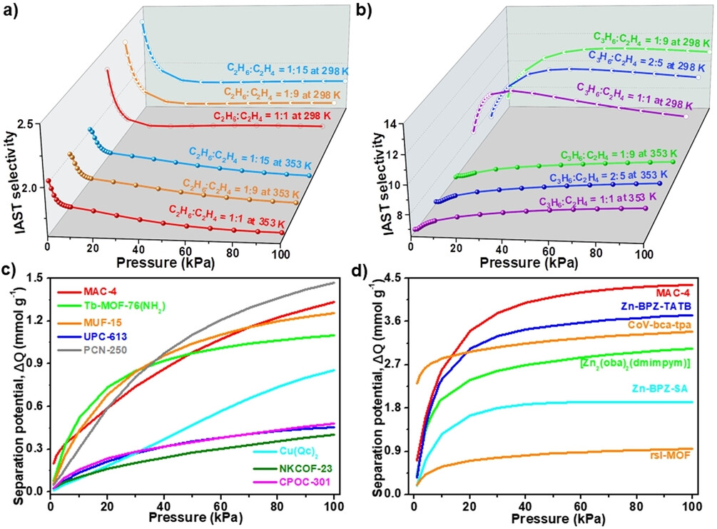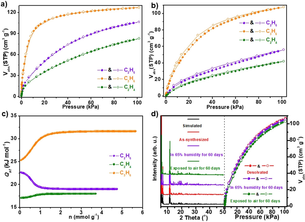 4)分离选择性:C2H6/C2H4和C3H6/C2H4混合物的初始选择性分别为2.0/2.3/3.8和8.6/9.5/16.2。对于C2H6/C2H4混合物,ΔQ值在353、298和273 K时分别为0.5、1.3和1.9 mmol g−1。