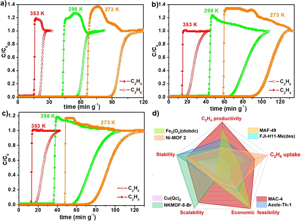 3)此外,MAC-4还能够从C3H6/C2H6/C2H4三元混合物中一步获得C2H4(≥99.9%)和C3H6(≥99.5%),并创纪录地提供了27.4和36.2 L kg−1的产品产量。