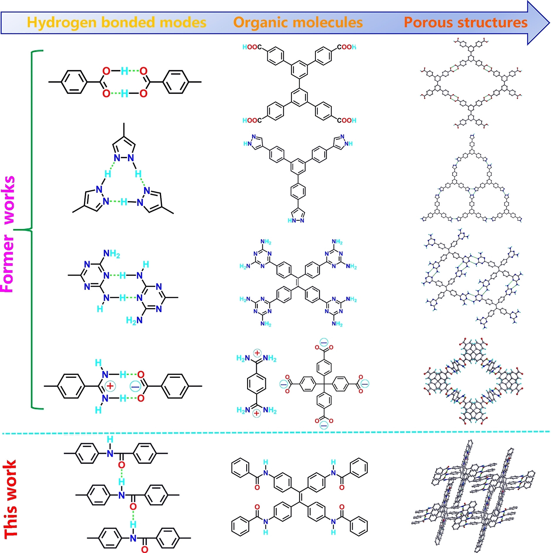 2)单晶X射线衍射:证实了MTHOF-1具有榫卯型孔洞结构,通过侧向N−H⋅⋅⋅O氢键连接形成连续的氢键链。
