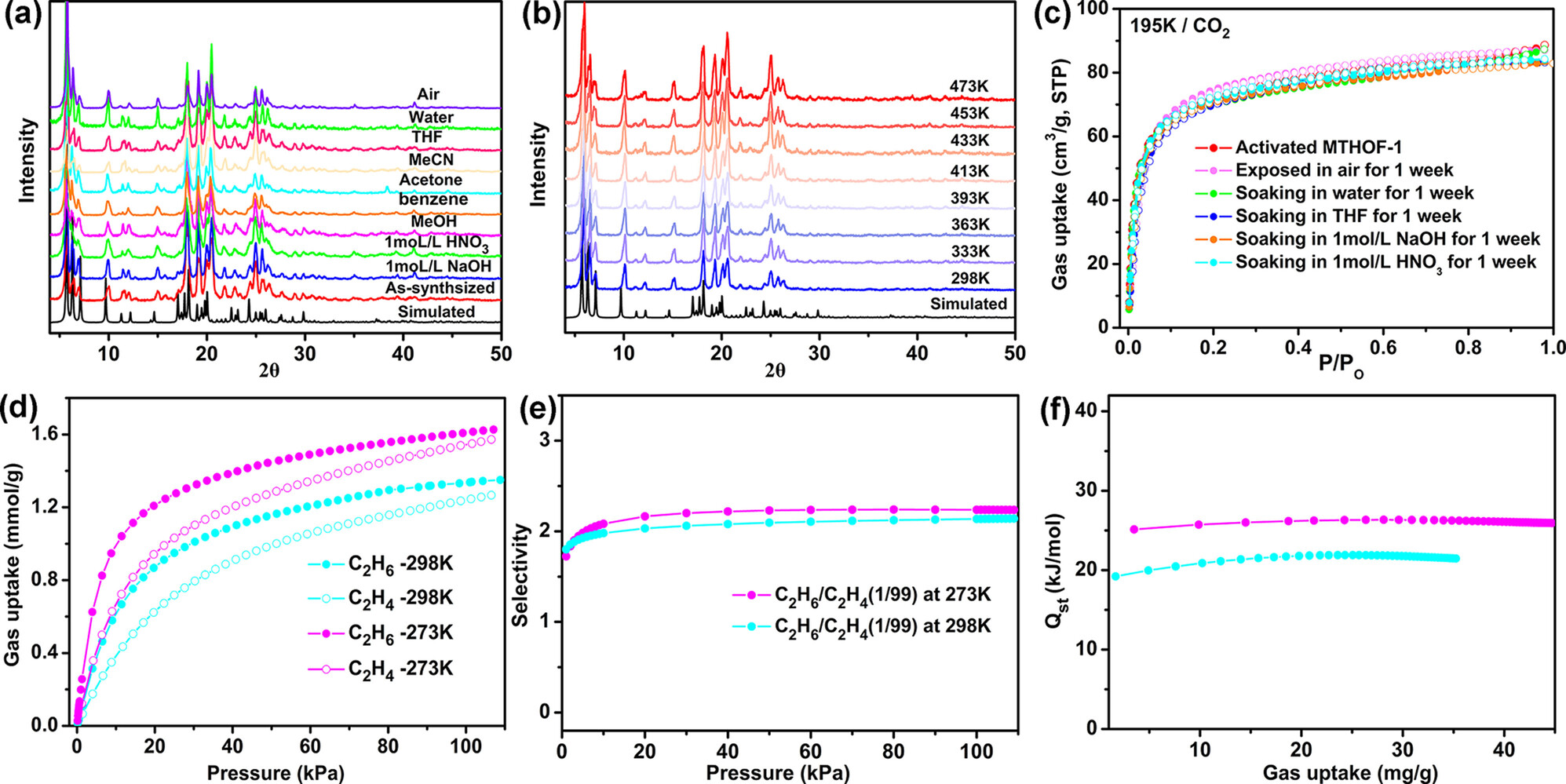 4)气体吸附:通过CO2和C2H6/C2H4吸附实验评估了MTHOF-1的孔隙特性和分离性能。