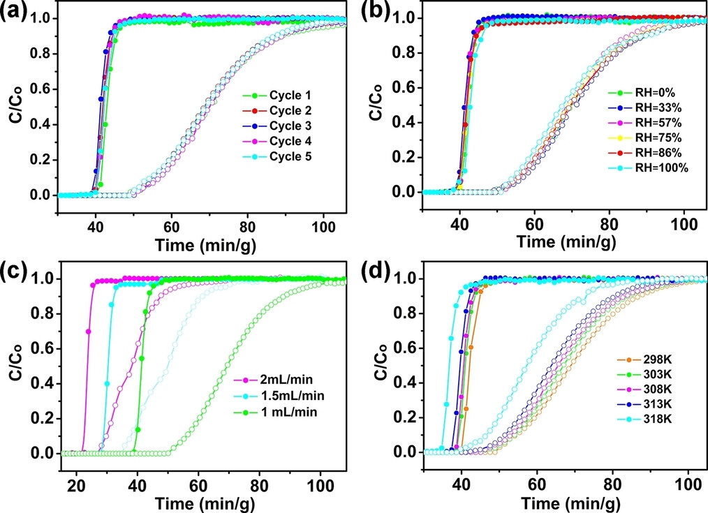 2)即使在高湿度条件下,MTHOF-1也能在实际突破实验中保持良好的分离性能。这些结果证明了MTHOF-1可以实现从C2H4/C2H6混合物中一步获得高纯度C2H4。