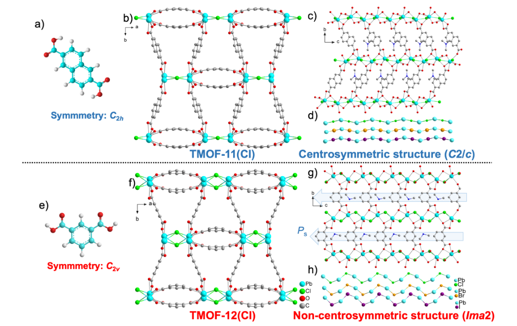 1. 晶体结构分析:确定了TMOF-12(Cl)和TMOF-12(Br)的晶体结构,揭示了它们的非中心对称性和铁电性来源。