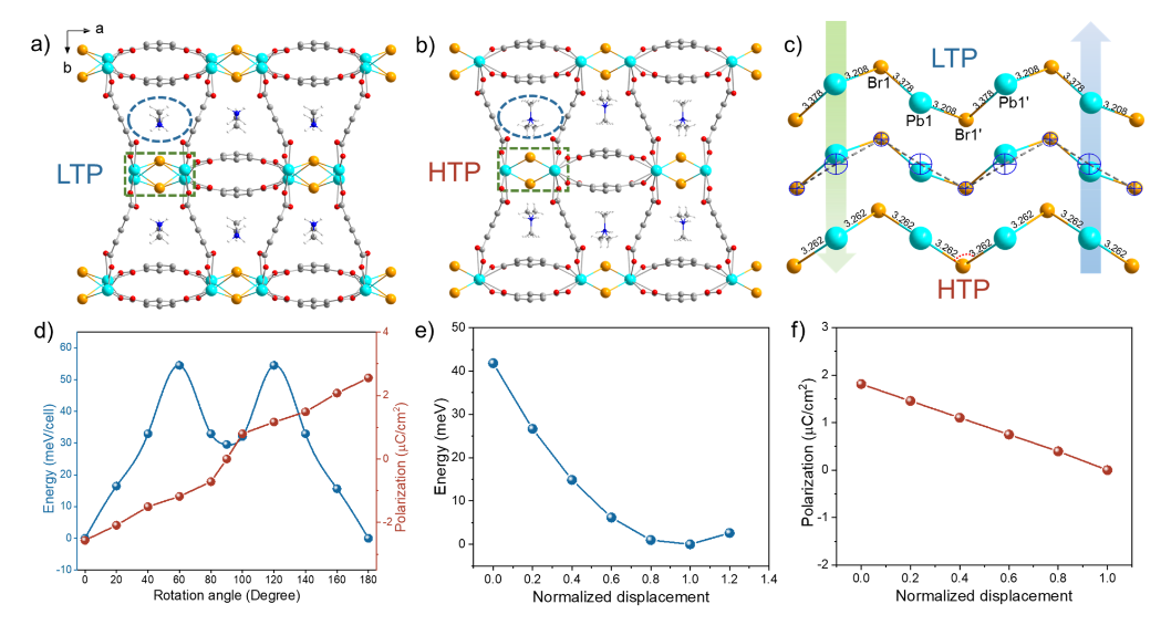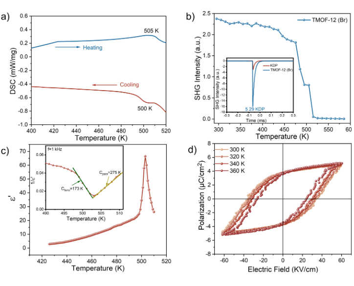 3. 铁电性能测试:TMOF-12(Br)在505 K时具有高达4.5 μC/cm^2的自发极化强度。