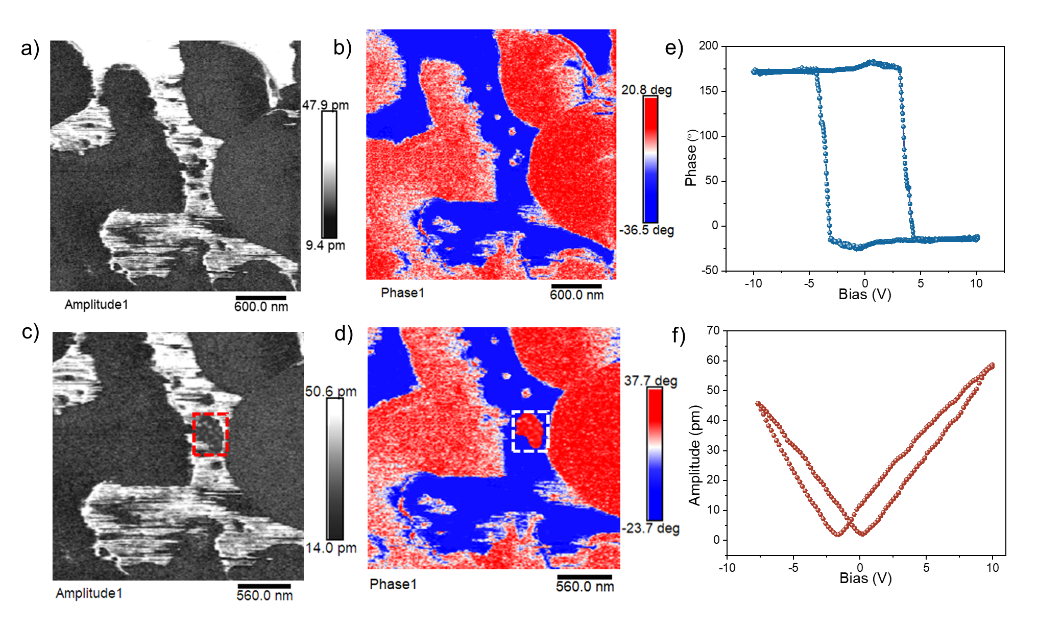 4. 铁电性能测试:通过极化-电场(P-E)回线测试和压电响应力显微镜(PFM)对MOFs的铁电性能进行了表征。