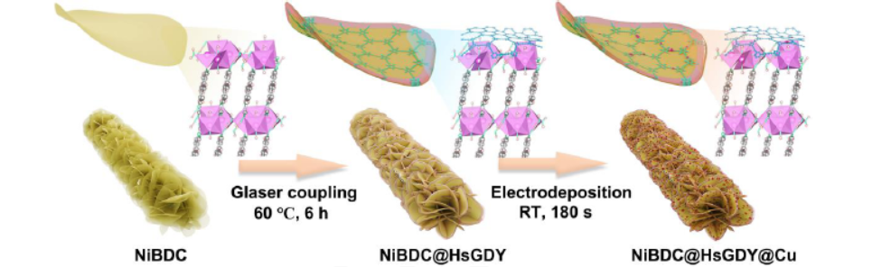 1. 合成实验:作者通过溶剂热法合成了Ni(OH)2纳米片阵列,并使用Ni(OH)2作为前驱体,通过溶解-再沉淀法制备了超薄NiBDC纳米片阵列。此外,通过Glaser偶联反应在NiBDC表面涂覆了HsGDY层,并通过电沉积法在HsGDY上负载了Cu单原子/簇,制备了NiBDC@HsGDY@Cu纳米片阵列。