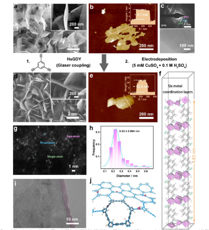 1. 结构表征:使用SEM、AFM、TEM和XRD等技术对所制备的NiBDC、HsGDY和Cu单原子/簇的结构进行了表征,确定了其形态和晶体结构。