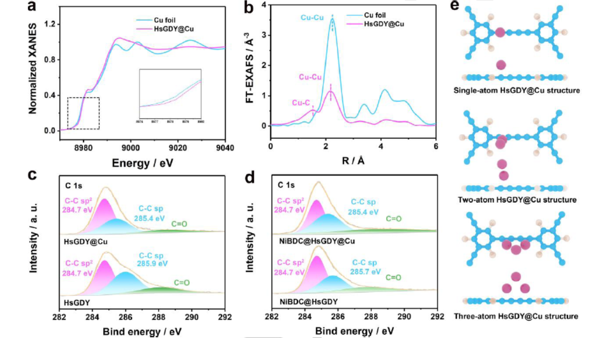 2. 化学组成分析:使用XPS、FTIR和Raman光谱对材料的化学组成和官能团进行了分析,揭示了HsGDY的sp2和sp杂化碳原子结构以及与Cu的相互作用。