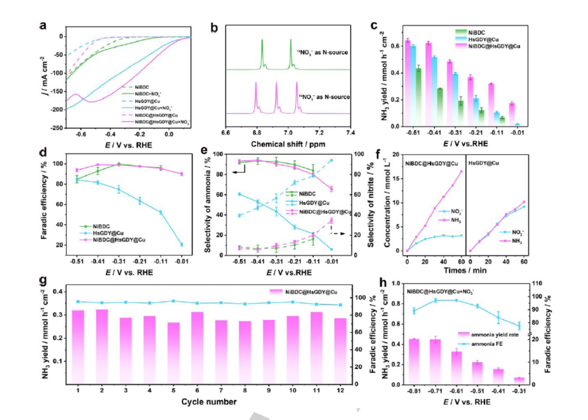 3)作者提出了一种新的串联催化策略,利用HsGDY作为电子/离子传导桥,结合Ni-MOF和Cu单原子/簇,实现了硝酸盐到氨的高效转化。