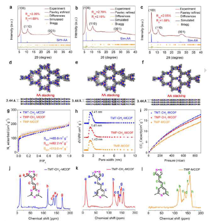 - CO2吸附量测试表明,TMT-CH3-MCOF、TMP-CH3-MCOF和TMP-MCOF在298 K下的吸附量分别为17.6、16.8和13.9 cm³ g⁻¹。