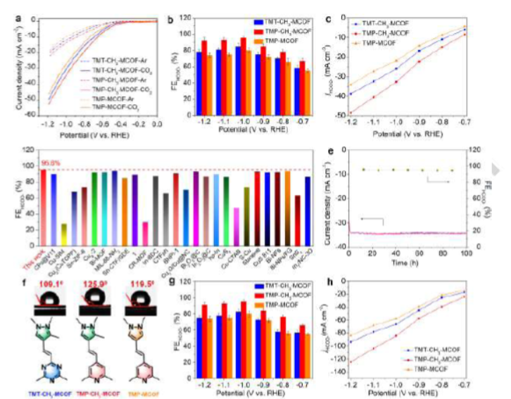 - TMP-CH3-MCOF在-1.0 V vs RHE下展现了最高的甲酸盐法拉第效率(FEHCOOO-)95.6%,在-1.0到-1.2 V电压范围内FEHCOO-保持在90%以上。